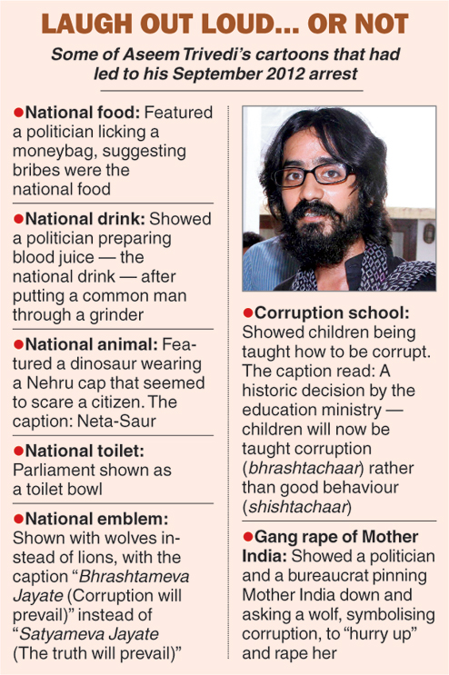 He was arrested in September 2012 on a politician's complaint, after angering Maharashtra's then Congress-NCP government by backing up Anna Hazare's anti-corruption campaign with his cartoons.