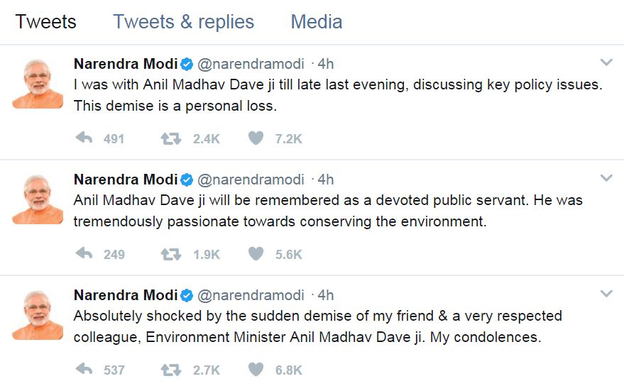 ”Absolutely shocked by the sudden demise of my friend & a very respected colleague, Environment Minister Anil Madhav Dave ji. My condolences,” he said in the tweet. “The demise is a personal loss.”