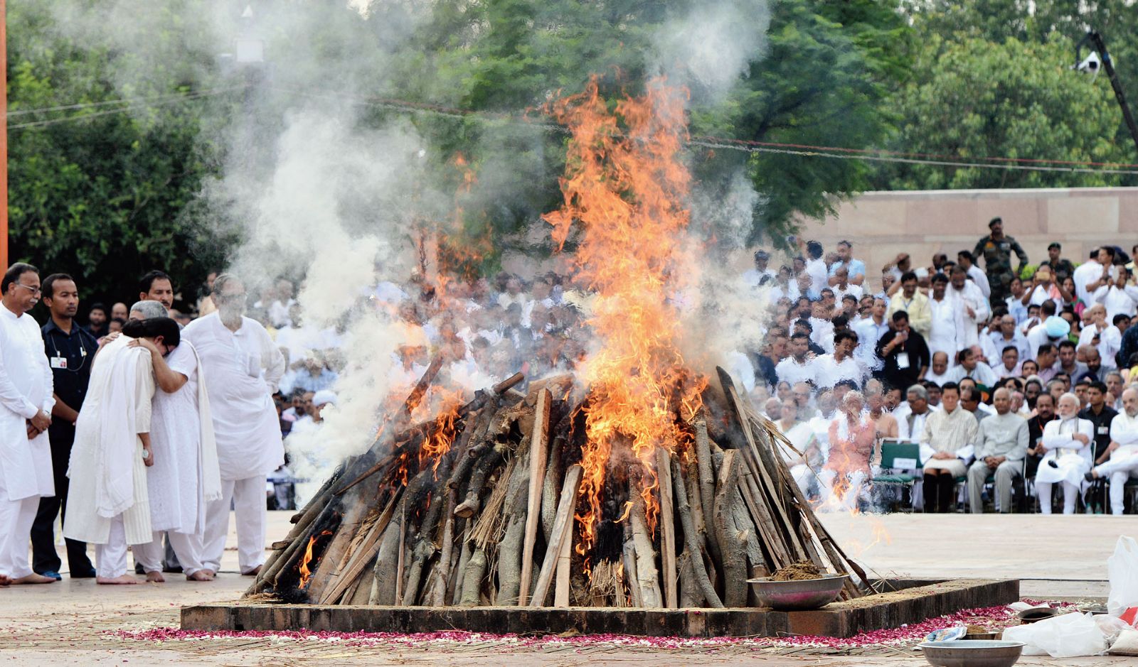 Another round of elaborate ceremonials done - the laying of wreaths, the sounding of the Last Post by an inter-services band, the burst of a gun salute - Vajpayee's foster daughter and doughty and diligent server for many a year, Namita, came afore with a serving of fire fed by camphor.