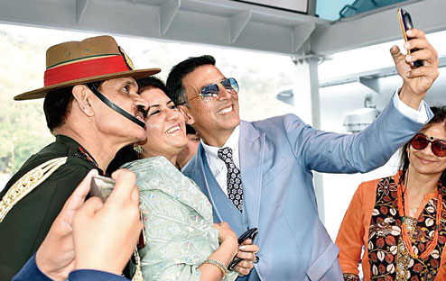 On board the ship, from which the President reviewed a fleet of 92 ships that included 24 foreign warships from 21 countries, Akshay clicked a "selfie" with Gen. Suhag, the army chief.