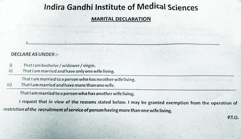 "The institute follows the same protocol which is being followed by New Delhi's AIIMS. It's the same form," the doctor claimed, adding that filling the marriage declaration form is necessary because it determines the nominee in case of retirement or seeking a job on compassionate ground.