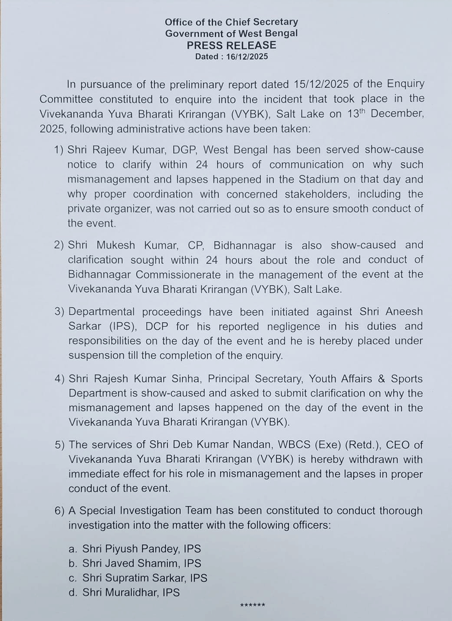 The West Bengal government on Tuesday issued a show cause notice to Director General of Police Rajeev Kumar over the security and crowd management lapses during Lionel Messi’s GOAT India tour event at Salt Lake Stadium last Saturday.