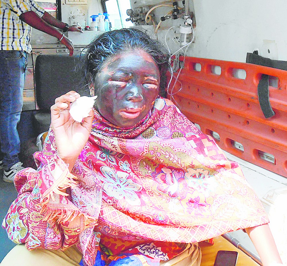 The mother of two, aged about 40, has a blackened, swollen and burnt face. She is stable but under intensive care at Apollo Hospitals, New Delhi, where she was taken after her condition worsened on February 21.