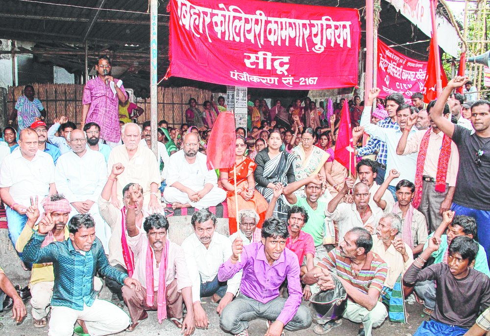 Dhanbad, April 8: Over 1,000 labourers of Bharat Coking Coal Limited (BCCL), led by Nirsa MLA Arup Chatterjee, gathered for a mammoth dharna at Randhir Verma Chowk today, demanding district administration and police action against "goons hired by private companies".