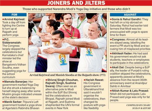 New Delhi, June 21: A widely popular Yoga Day programme today sent the Congress scrambling to advertise its yogic credentials lest its unspoken boycott invite an "anti-yoga" tag, while a gleeful BJP counted its perceived political gains.