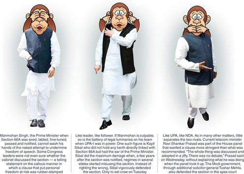 Salman Khurshid, who was not in the UPA-I ministry, told The Telegraph: "There were vicious campaigns on the Internet against people, religion, groups... complaints came from different quarters. Women were targeted viciously. Experts said India didn't have adequate laws to combat cyber crime. In fact, during UPA-II, the campaign was so vicious that it would not be permitted anywhere in the world. Kapil Sibal as telecom minister (2011-14) tried to discuss the problem with service providers... they were very co-operative. Some extremely offensive contents were blocked."
