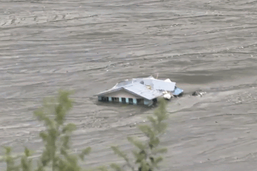 Damaged houses at a disaster-hit area amid a search and rescue operation in the aftermath of the recent flash floods, at Dharali area(PTI)