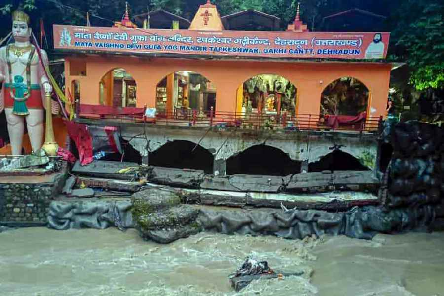The boundary wall of Tapkeshwar Mahadev Temple collapses following incessant monsoon rains, in Dehradun(PTI)