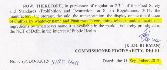 Health department officials said the government had issued a notification in September 2012, in pursuance of a series of directions from Supreme Court for a ban on 'gutka' in the city.