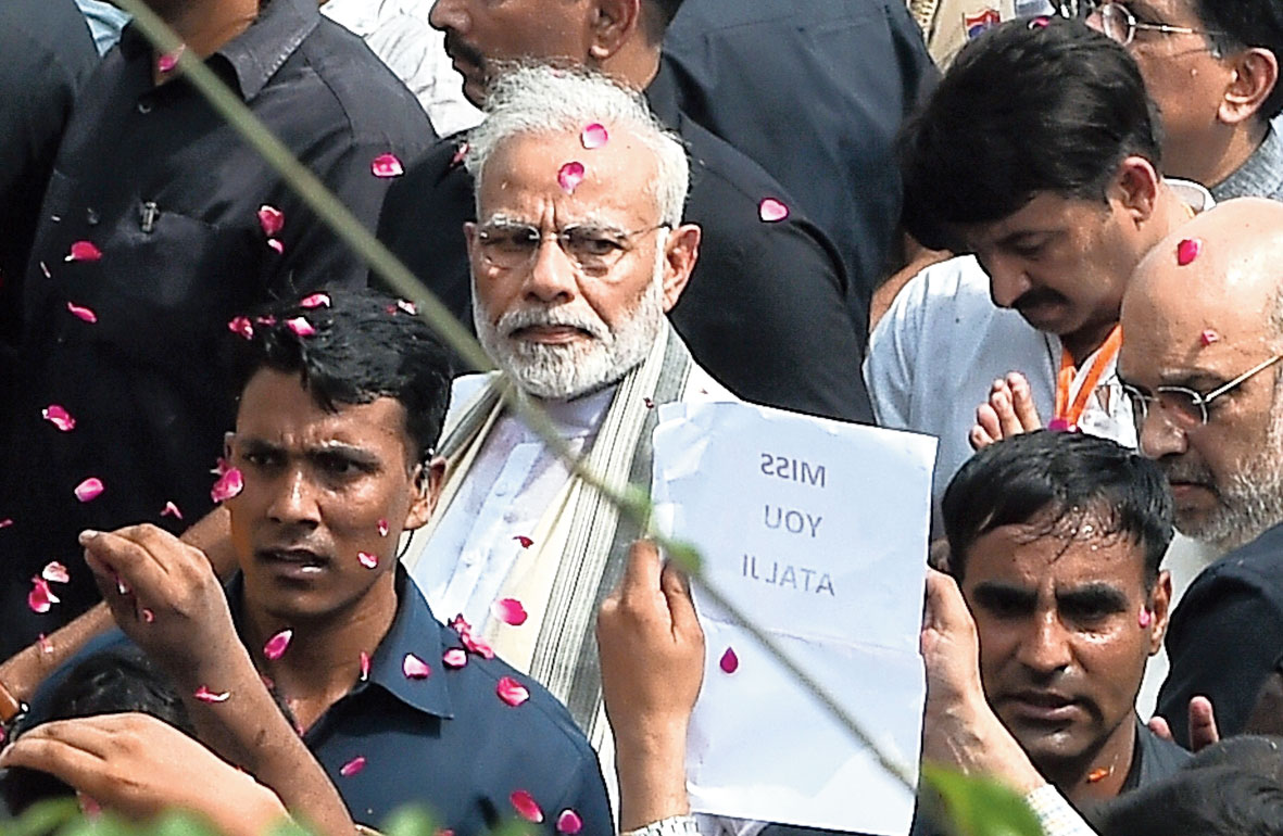 Accompanied by some other leaders, who were forced to walk when the party's top two hit the road, Modi and Shah covered the 5km distance to Smriti Sthal in one-and-a-half hours. All the way, the TV cameras were focused on them. The crowd around raised slogans of "Atalji amar rahen."