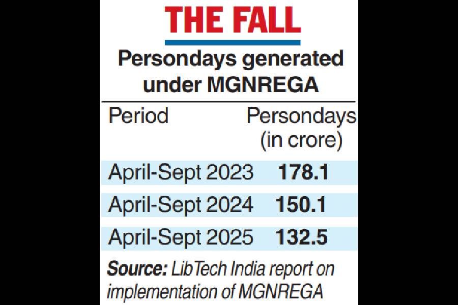 Among the 11 states, the steepest decline in persondays was noticed in Uttarakhand (54.3 per cent), followed by Telangana (47.6 per cent). Jharkhand saw a 56.4 per cent rise in persondays and Madhya Pradesh 30.5.