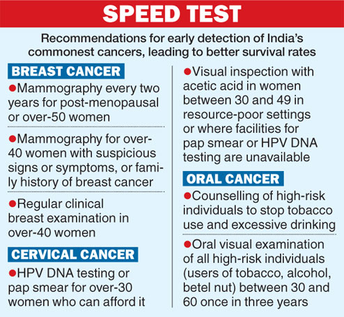 The panel's recommendations for breast, cervical and oral cancers, tailored to cover high-income and low-income households, come amid longstanding concerns that over 70 per cent of cancer patients in India seek treatment in the advanced stages of their disease.