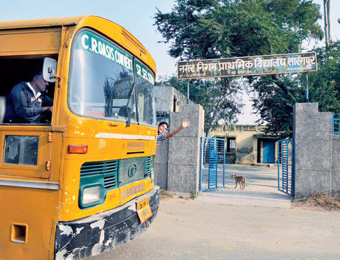 A boy waves from a private school’s bus as it drives past the Hindi-medium civic primary school in Sarangpur village on Delhi’s outskirts