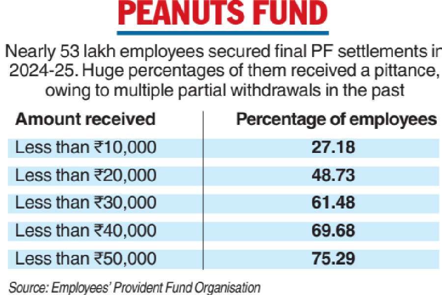 Official data accessed by The Telegraph suggest that frequent partial withdrawals by EPFO members — on grounds of children’s education, marriage, illness, disability, disaster, emigration or closure of establishment — are seriously depleting their PF corpus.