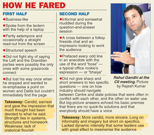 Addressing the CII’s two-day national conference, Rahul eschewed talk of the economy, policy specifics, fiscal deficits or the investment climate, leaving these subjects to the assembled bureaucrats and ministers. The omission appears to have disappointed a section of foreign investors, diplomats and the western media expecting specific answers.