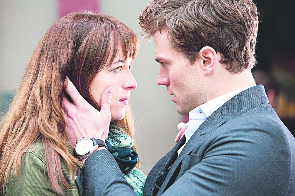 Dakota Johnson (left) and Jamie Dornan in a scene from Fifty Shades of Grey
