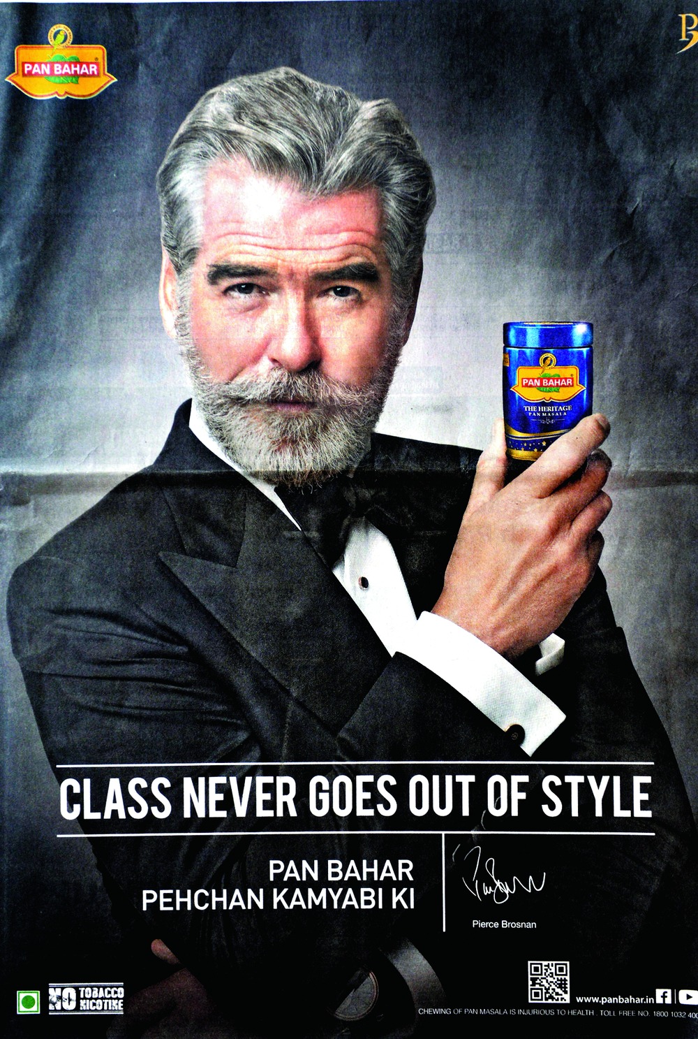 Hollywood actor Pierce Brosnan, who has acted in four James Bond movies, has become the new face of the pan masala brand, peddling a product many doctors consider only slightly less harmful than its poorer cousin, gutkha.