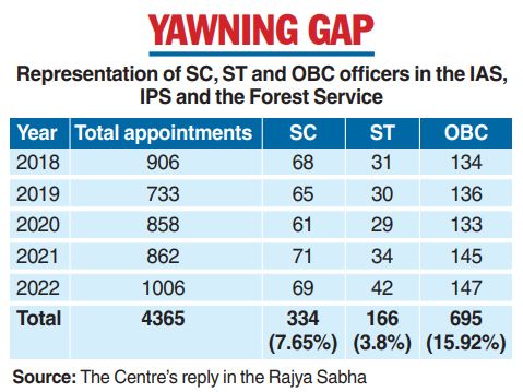 According to the government data, 4,365 people were directly recruited to the Indian Administrative Service (IAS), Indian Police Service (IPS) and the Indian Forest Service (IFoS) during this period. Of them, only 334 (7.65 per cent) were from the SC communities, 166 (3.8 per cent) from the ST communities and 695 (15.92 per cent) from the OBCs.
