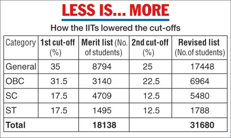 Of the 12,079 seats on offer, 3,261 were reserved for the Other Backward Classes under their 27 per cent quota. But under the original aggregate cut-off of 31.5 per cent for this category, only 3,140 OBC candidates made it to the first merit list.