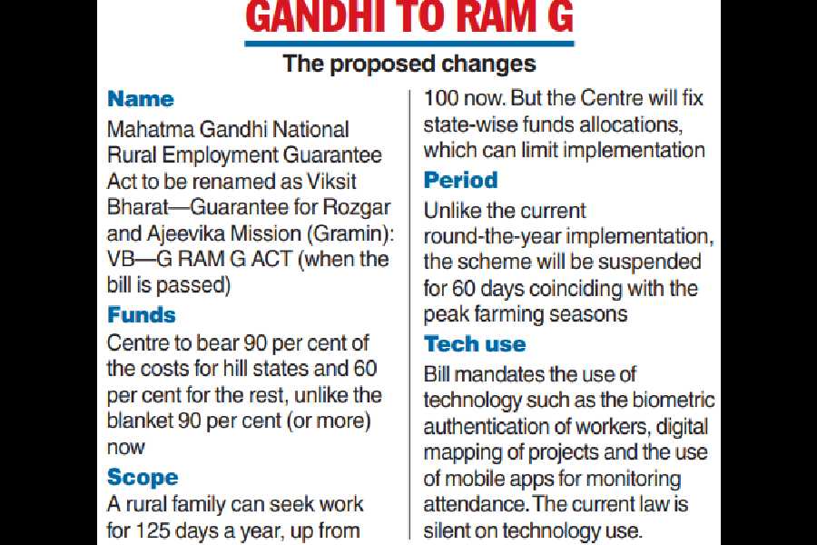 The bill, likely to be tabled this week, includes proposals to reduce the Centre’s burden of funding for the UPA-introduced rural job scheme, suspend the projects for 60 days during peak agricultural seasons, and have workers mark their attendance digitally. (See chart)