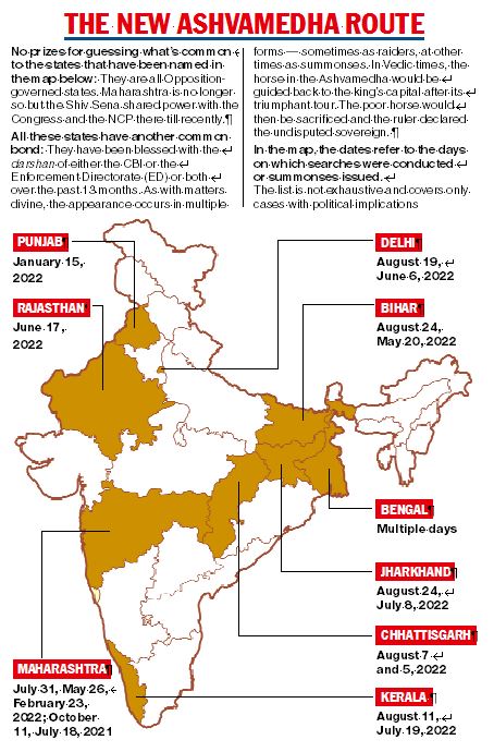 In Bihar, the CBI “searched” 27 locations, besides an under-construction mall in Gurgaon, in a 14-year-old land-for-jobs case in the railways. The swoop, spread across Bihar and Delhi NCR, covered five senior RJD leaders, including two Rajya Sabha members and an MLC.