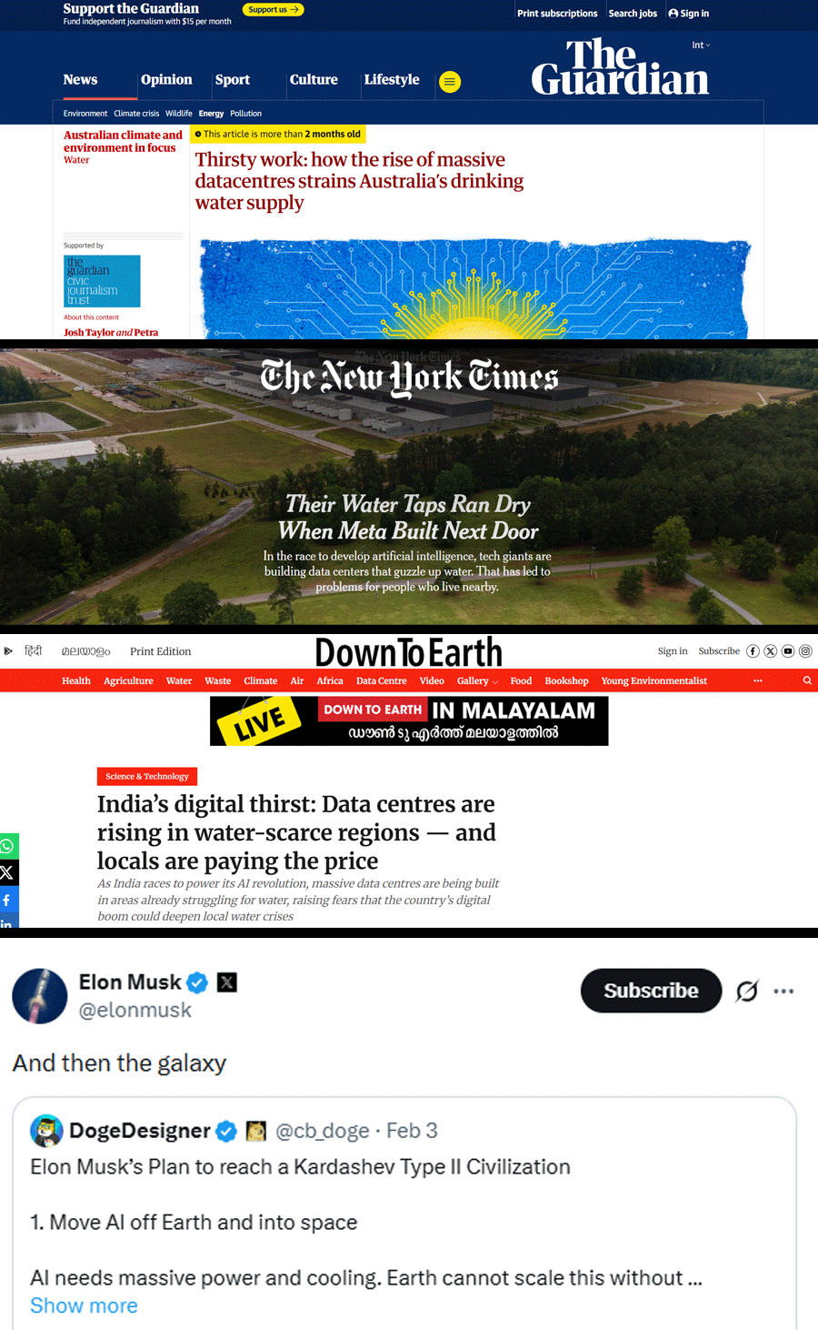 The relation between AI and water is cropping up across the world. In California, the global epicentre of AI, annual wildfires require vast volumes of water, with over 10 million gallons consumed in one week alone in 2020. Elon Musk, the world’s richest man, is reportedly considering building data centres on the Moon to get over the heating up problem. Strain on water has also worried experts in Australia with dozens of new investments in datacentres in Sydney and Melbourne.
