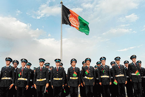 | The largest Afghan flag flutters behind soldiers at the inauguration ceremony on Wazir Akbar Khan hill in Kabul on September 10. (AFP) |