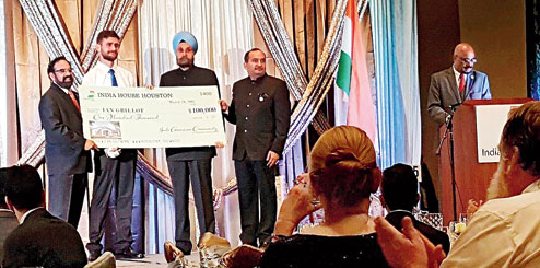 India's ambassador to the US Navtej Sarna handed over the cheque to Grillot, who was honoured at the 14th annual gala of India House Houston here.