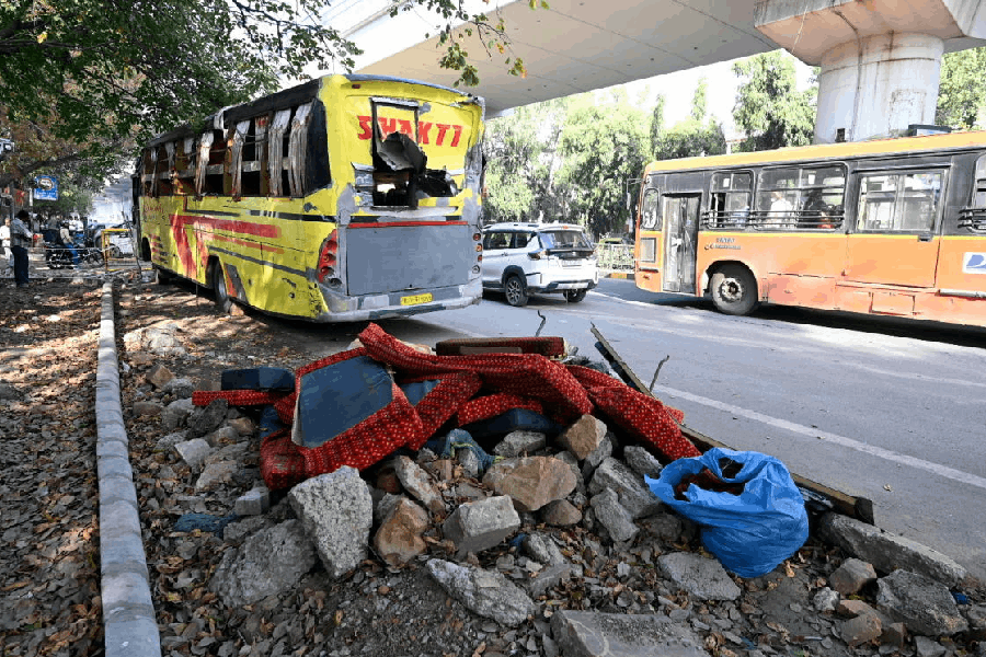 New Delhi: Damaged seats lie at a roadside after a sleeper bus overturned near Hanuman Mandir, in Karol Bagh area, New Delhi, Wednesday, March 25, 2026. Two passengers were killed and 23 others injured in the incident. (PTI Photo)