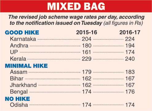 New Delhi, March 29: The revised wage rates for the flagship rural job scheme were announced today, with eastern states getting a minimal or even zero increase but those in the south bagging good hikes.