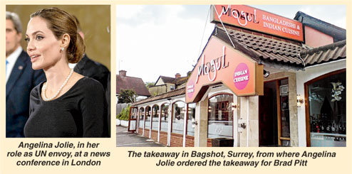 Jolie didn’t herself go to the Mogul restaurant in Bagshot, Surrey, since she was busy in London attending the G8 summit of foreign ministers in her role as a goodwill ambassador for the United Nations High Commissioner for Refugees — the summit was seeking to outlaw the use of rape as a weapon of war.