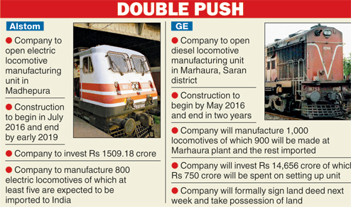 The project will be executed by a recently formed joint venture in which Alstom and the Indian Railways will hold a 74 and 26 per cent stake, respectively. Earlier, senior Alstom officials had pointed out that the project would create around 3,000 jobs. In November last year, the Centre signed agreements with Alstom and GE in connection with setting up of manufacturing units of electric and diesel locomotives in Madhepura and Marhaura (Saran), respectively.