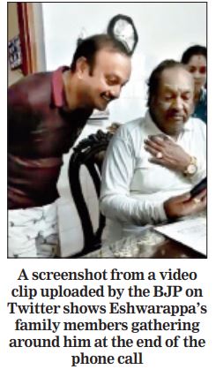 A screenshot from a video clip uploaded by the BJP on Twitter shows K.S. Eshwarappa on a call. The BJP tweet said “Shri @narendramodi held a telephonic conversation with” Eshwarappa Sourced by The Telegraph