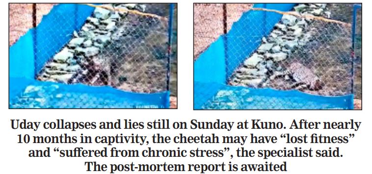 On Sunday, the cheetah collapsed and breathed its last behind a fence in Kuno National Park, Madhya Pradesh. Uday was 6.