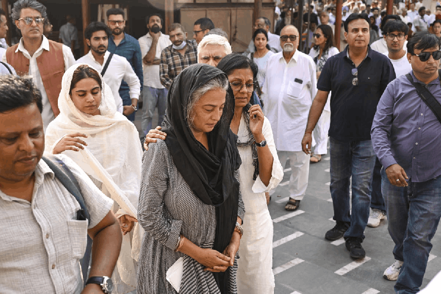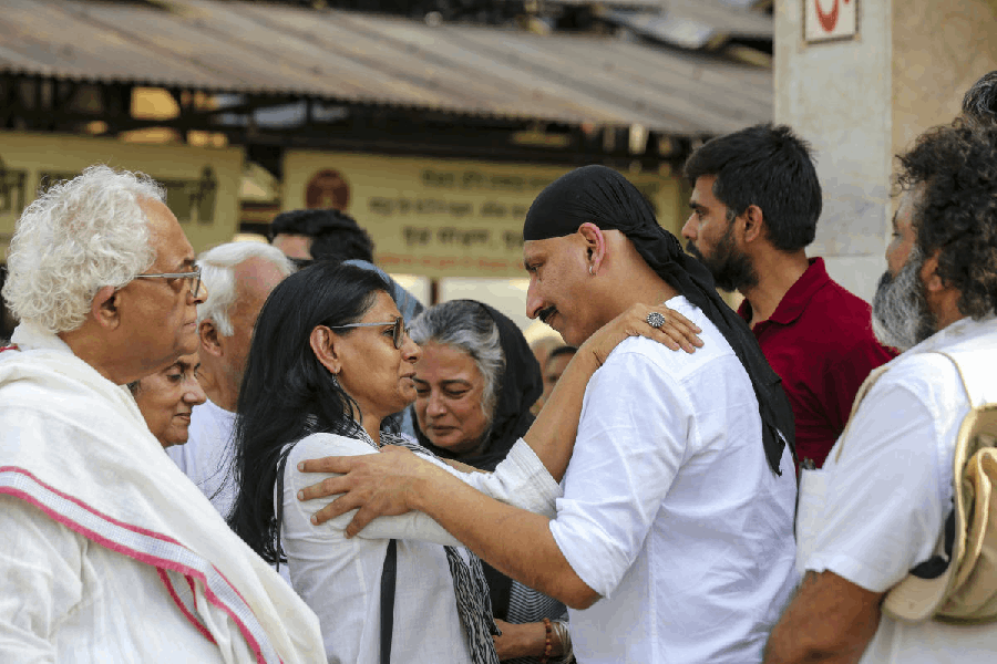 Late legendary photographer Raghu Rai's wife Gurmeet, centre, and son Nitin, front right, are consoled by actor Nandita Das, front second left, and others during Rai's last rites, in New Delhi, Sunday, April 26, 2026. Rai, one of India's best known photographers who distilled the essence of an evolving India and its people through his lens, died at a private hospital in the early hours of Sunday at the age of 83 (PTI Photo)