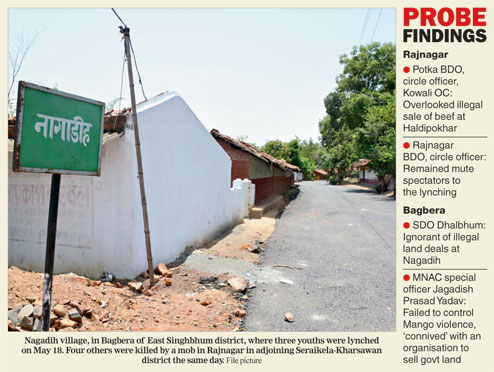 The report said that Potka BDO, circle officer and Kowali OC had overlooked the illegal sale of beef at Haldipokhar despite a blanket ban across the state. The Rajnagar BDO and circle officer, who were sent as magistrates to Shobhapur in Rajnagar, remained mute spectators to the lynching.