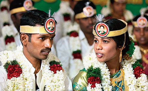 After quick rituals at a temple in Udumalpet town, around 425km from Chennai, the couples were taken to a community hall where they were seated to receive gifts and listen to speeches by party leaders.