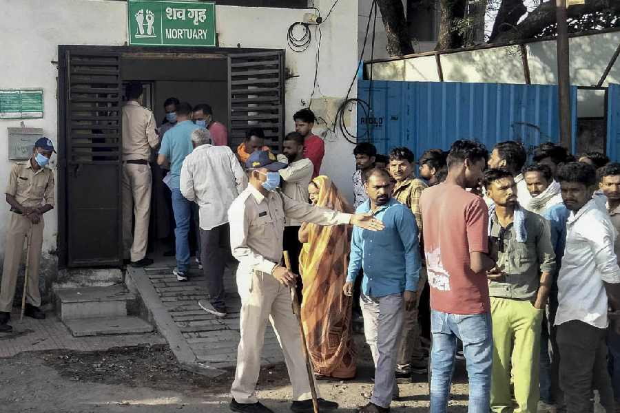 Family members of those died in a collision between a pick-up van and an SUV on Wednesday night, gather outside an mortuary, in Madhya Pradesh's Dhar district, Thursday, April 30, 2026. At least 15 died in the incident. (PTI)