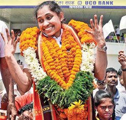Dipa and Nandi were taken in an open jeep to Vivekananda stadium. Frenzied fans lined both sides of the route and frequent halts were made to enable people to garland Dipa and Nandi. The 8km journey took around 2 hours.