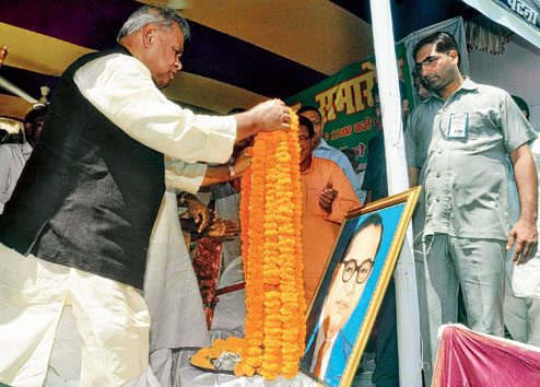 | Chief minister Jitan Ram Manjhi garlands a picture of Babasaheb Bhimrao Ambedkar during Mahadalit Samaroh at a ground in Rupaspur on Sunday. Telegraph picture |