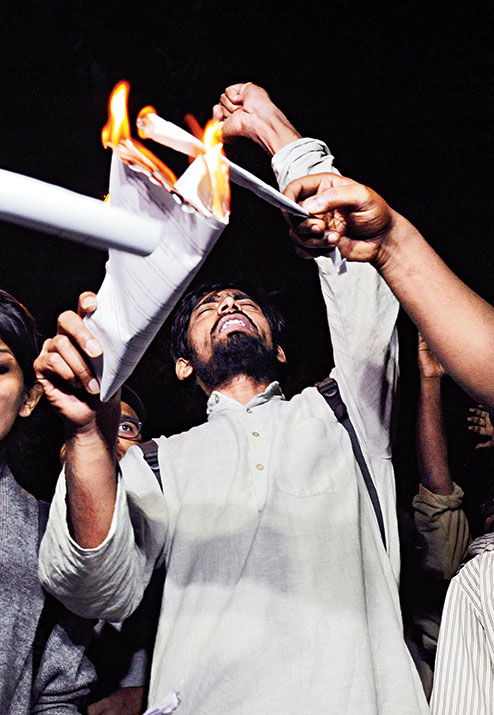 Narwal rolled four A4 sheets with 40 verses from the two-millennia-old Manusmriti, which codified the laws upholding the caste system. Lenin Kumar, a former JNUSU president who now belongs to the Democratic Students Federation that splintered from the SFI, asked around for a matchbox.