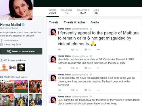 ”I just came back from Mathura and got the news of the violence that has taken place there in which policemen have lost their lives. So so upset by this news from a place, which is so dear to me. Will go there again if my presence is required. My heart goes out to the bereaved,” she said, in a series of tweets.
