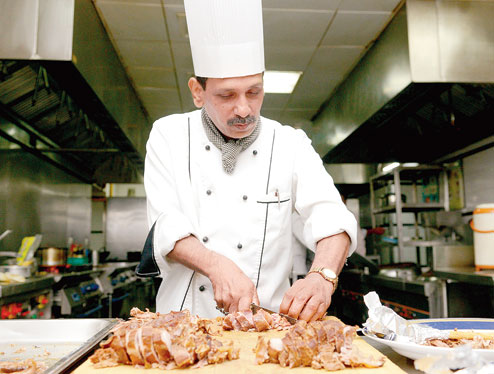 Rashtrapati Bhavan’s executive chef is busy carving a roasted leg of lamb. It comes cleanly off the bone, a crisp brown crust on the outside and pink on the inside.