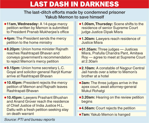 At 3.20am, the bench commenced the hearing. Grover argued for 45 minutes. The main points: the President had acted in haste, Memon was suffering from schizophrenia and the family should be given at least 14 days to prepare for the execution.