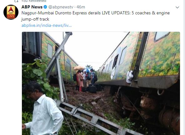 "12290 Nagpur-CSMT Duranto Exp derailed between Asangaon and Vasind. No injuries to any Passengers," Central Railway said on its twitter handle @Central_Railway.