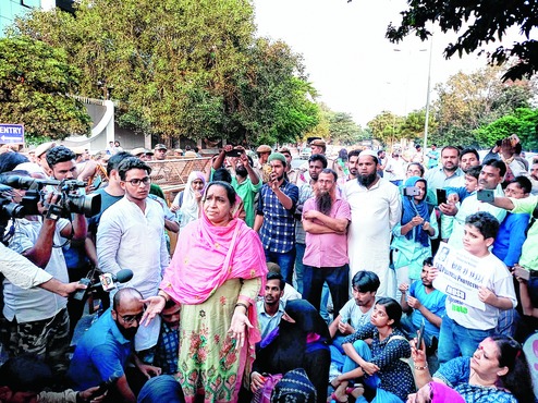 New Delhi, Oct. 13: Fatima Nafees, mother of missing JNU student Najeeb Ahmed, today shouted at the police as they jostled with protesting students outside the CBI headquarters.
