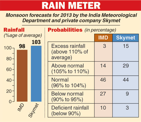 The India Meteorological Department (IMD) today released its preliminary long-range forecast, saying monsoon rainfall in 2013 would be 98 per cent of the long-period average . Any rainfall figure between 96 per cent and 104 per cent of the average is described as “normal”.