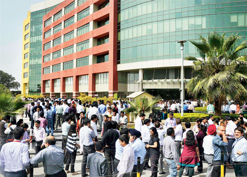 | Employees of multinational companies evacuate their offices in Gurgaon after ground vibrations were felt on Tuesday. (PTI) |