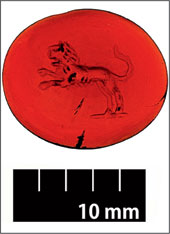 The Leaping Lion, one of the exhibits. The figure is etched on one side of a thin oval-shaped carnelian piece which is slightly curved or convex. The figure is placed horizontally on the carnelian (semi-precious gemstone) piece. This can be dated to the early centuries CE