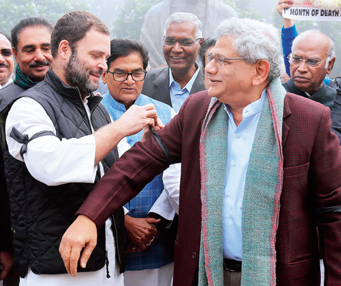 Before entering the House in the morning, members from 16 Opposition parties wore black bands and staged a silent protest at the Gandhi statue outside the building in solidarity with the families of those who had died following demonetisation.